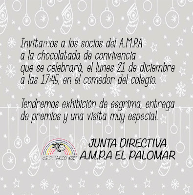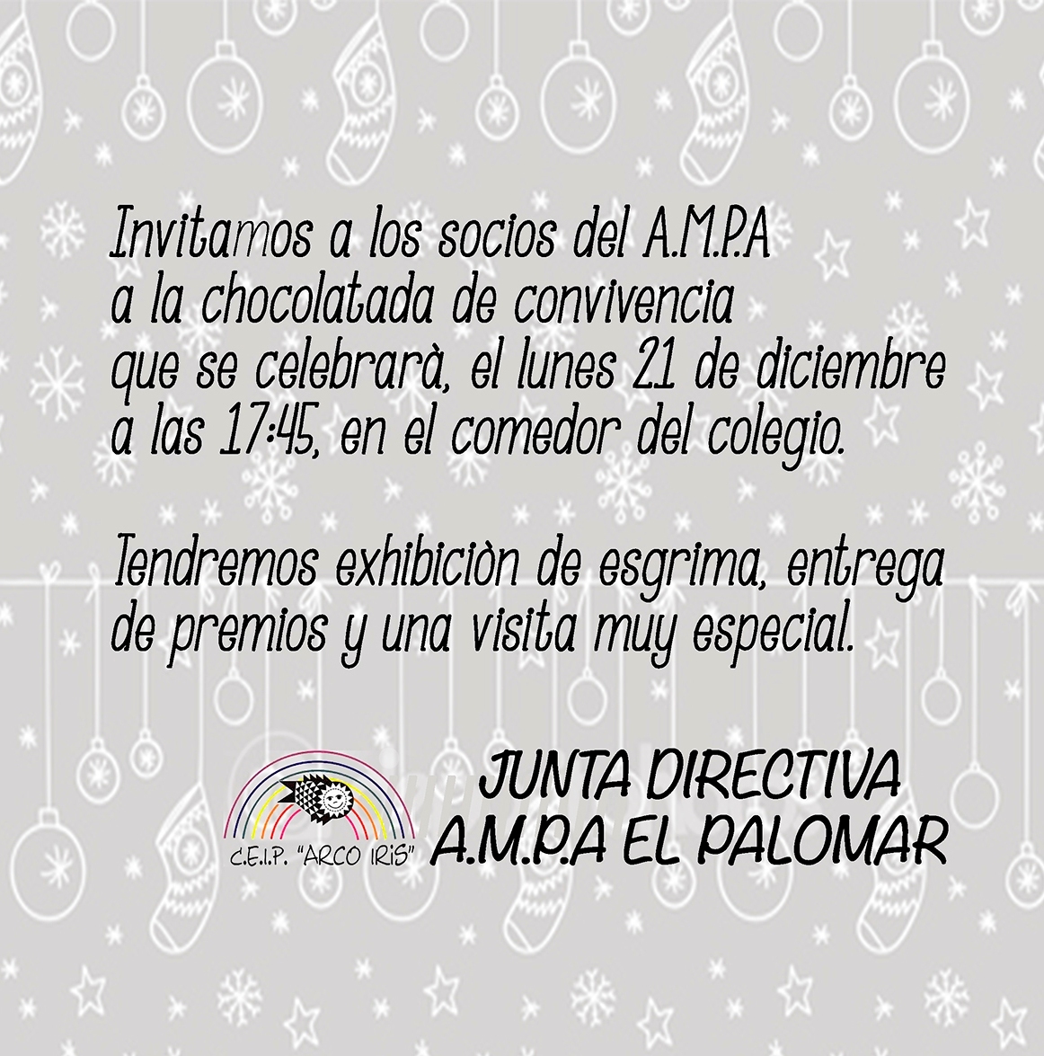 Comparte este artículo Share on FacebookShare on Facebook Share on XShare on X TweetShare on Pinterest Share on LinkedInShare on LinkedIn Navegación entre publicacionesAnteriorPublicación anterior:LAS PUERTAS DE LA ILUSIÓNSiguientePublicación siguiente:PAPA NOEL VISITA NUESTRA CHOCOLATADATe puede interesarChocolatada Navideña22 diciembre, 2018FIESTA DE LA AMPA EL PALOMAR 201611 junio, 2016DÍA DE ANDALUCÍA: PAN, ACEITE DE OLIVA VIRGEN EXTRA Y JAMÓN23 febrero, 2016PAPA NOEL VISITA NUESTRA CHOCOLATADA21 diciembre, 2015CONCIERTO – DÍA INTERNACIONAL DE LAS PERSONAS CON DISCAPACIDAD3 diciembre, 2015FIESTA DE LA CASTAÑA EN INFANTIL4 noviembre, 2015